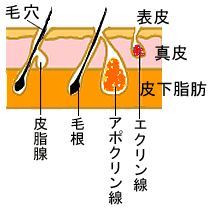 皮膚には、汗腺、アポクリン腺という3つの腺があります。これらの腺からは、異なる分泌物が出ます。皮脂腺からは、毛や皮膚を滑らかにする脂肪性の分泌物、汗腺は汗を出す腺です。